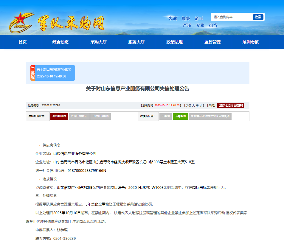 近日,军队采购网发布关于对山东信息产业服务有限公司失信处理公告。